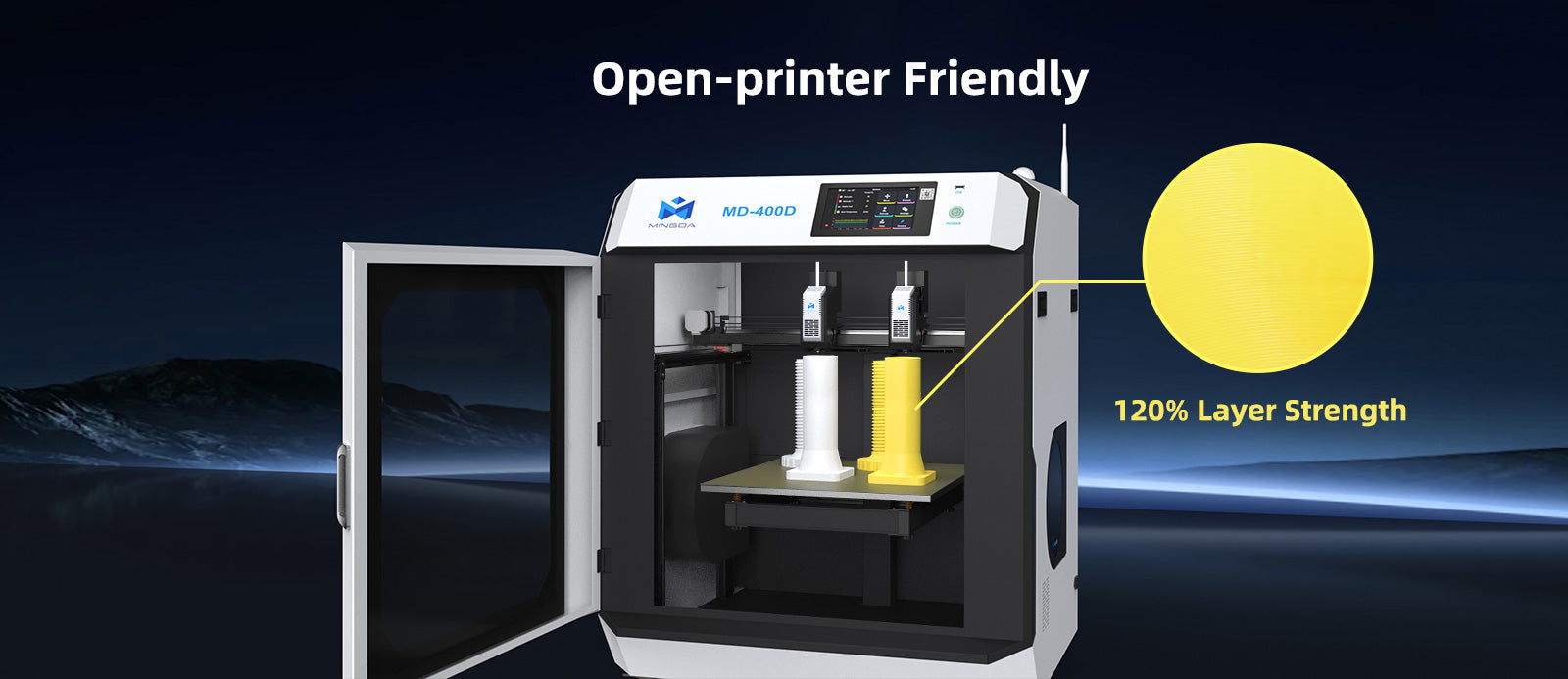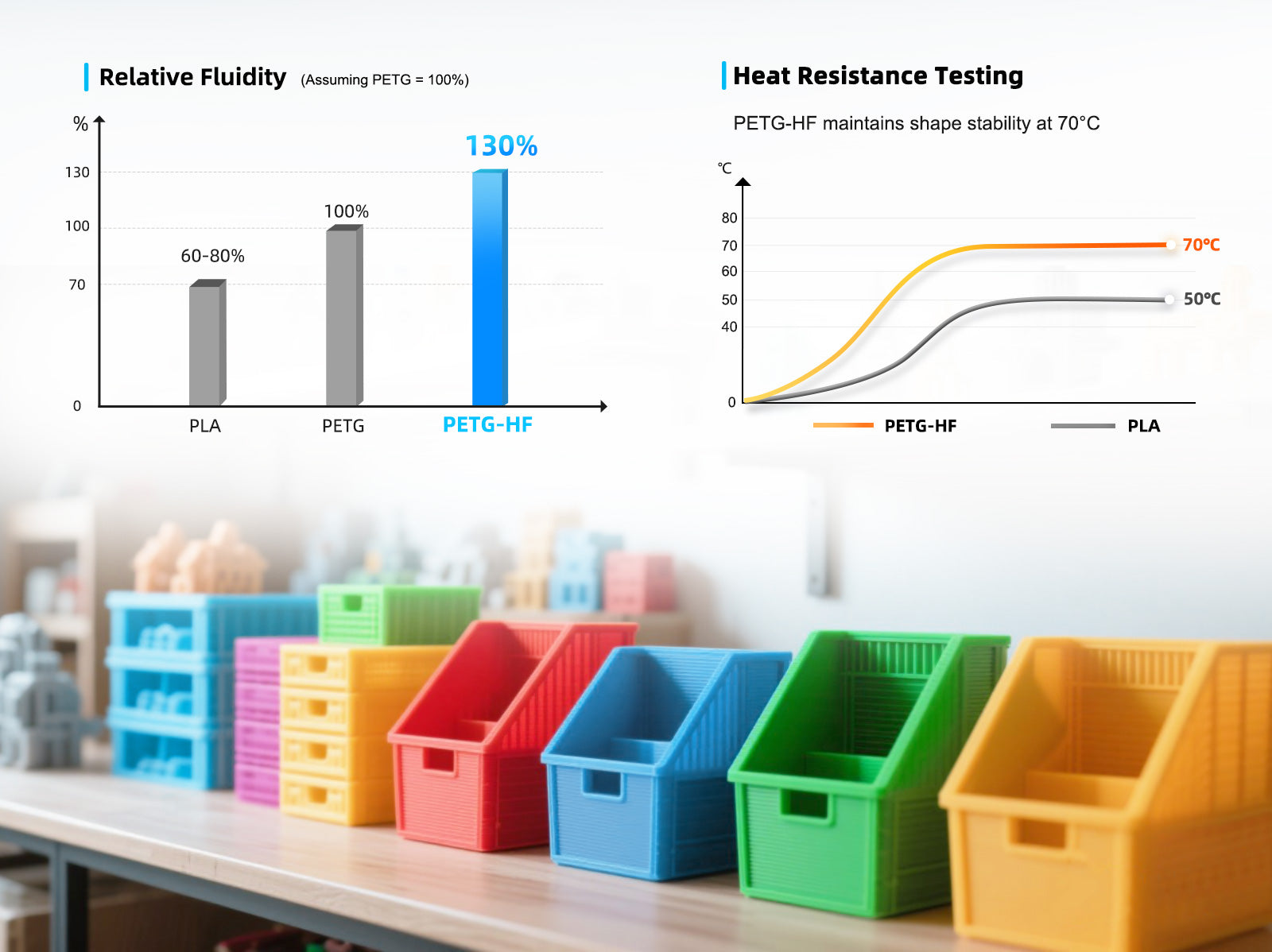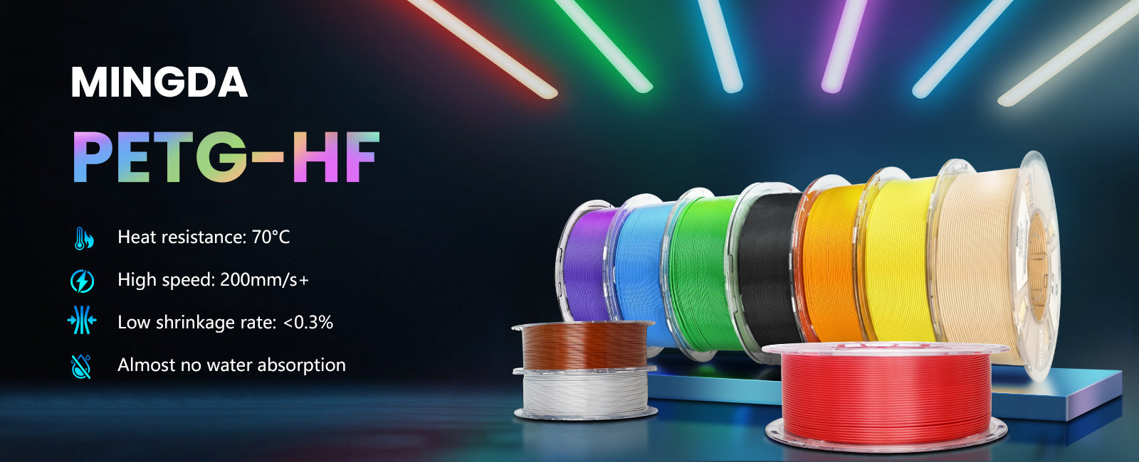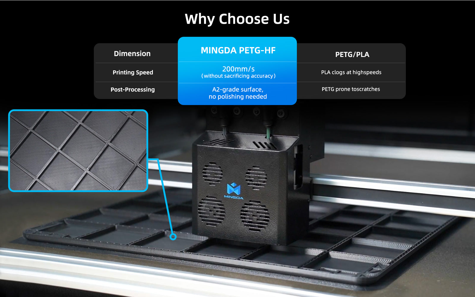 PETG-HF is a toughness modified PETG developed specifically for Highs peed printing, which provides excellent printability by improving material flow and have better mechanical strength and heat resistance compared to PLA.